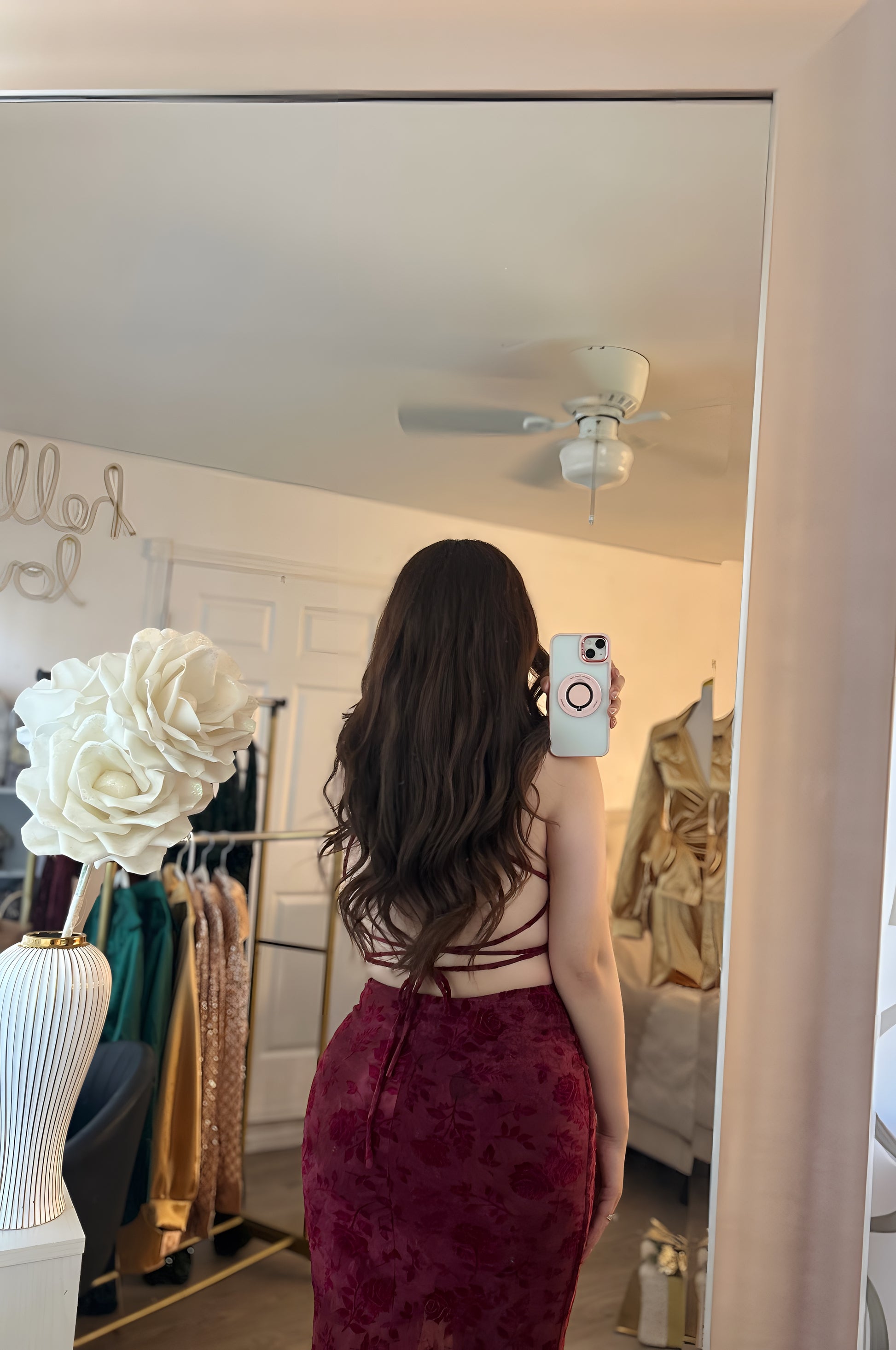 Made with rich burgundy velvet and a subtle floral texture, this figure-flattering maxi dress is perfect for Christmas parties, date nights, or any special occasion where you want to feel confident and feminine.
